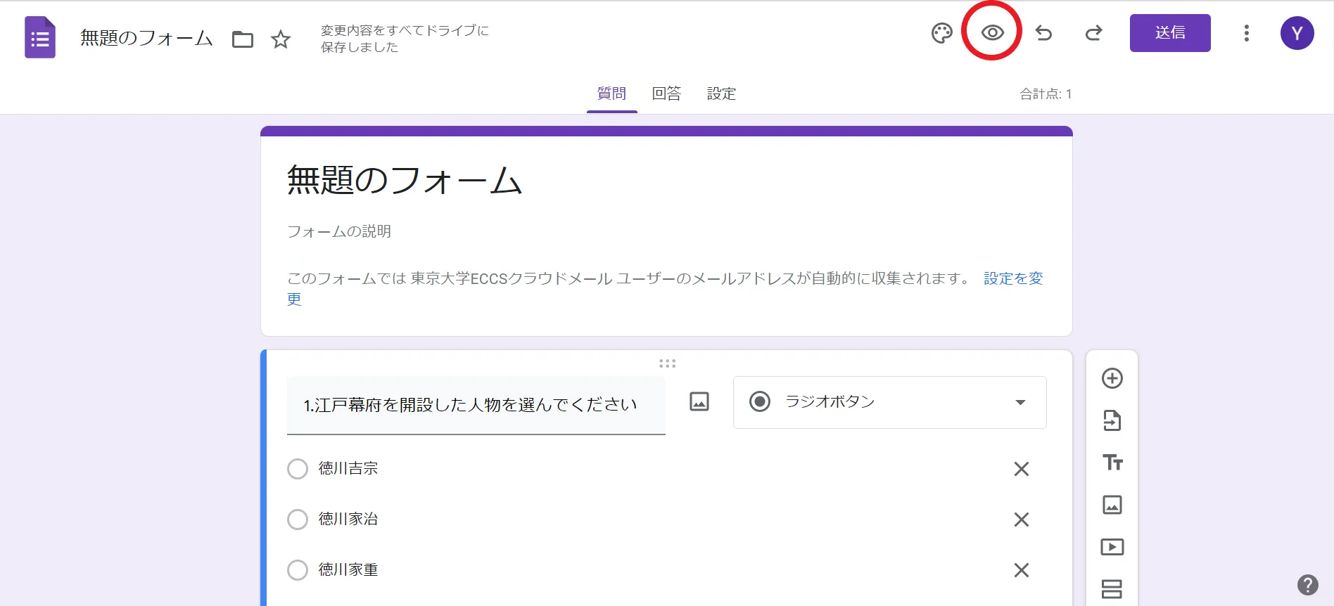 2. 「東京大学ECCSクラウドメールと信頼できる組織のユーザーに限定する」がオンになっていることを確認します.なお「メールアドレスを収集する」を選択しておくと,回答者のECCSメールアドレスが自動的に記録されます.