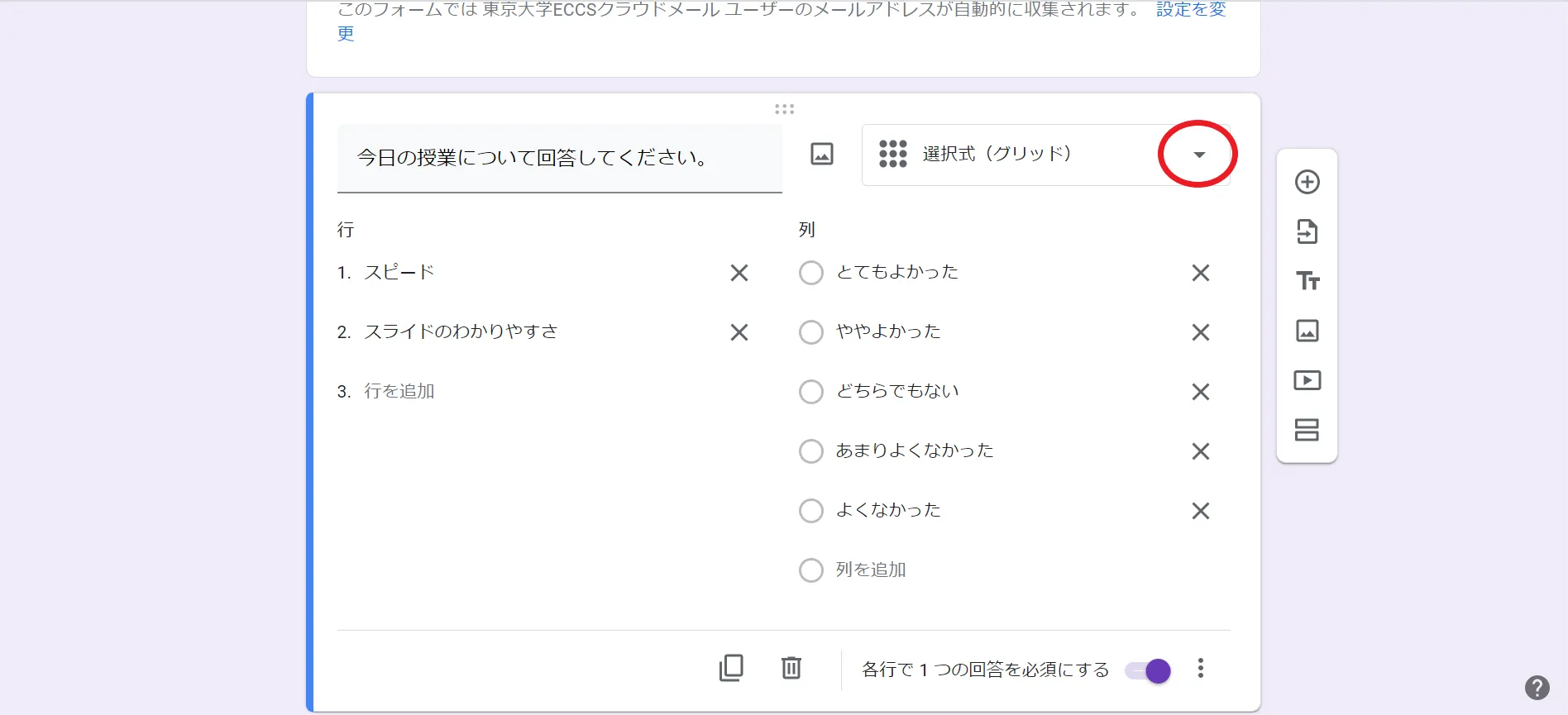 設問フォームの右側の下⽮印のアイコン(下図赤丸)をクリックし,「ラジオボタン」を選択します.下図の緑の枠内に問題を,⽔⾊の枠の部分に解答の選択肢を⼊⼒します.