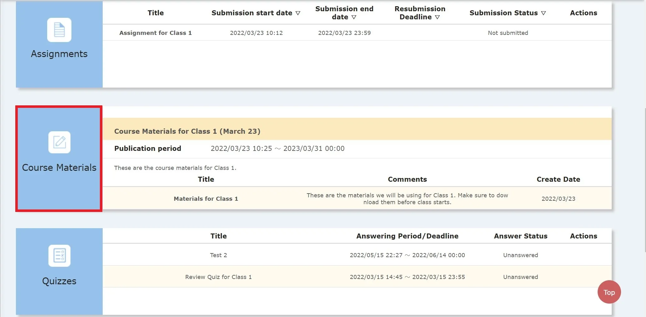 In ITC-LMS, you can place class materials such as slides in the “Teaching Materials” section. Please refer to this page for details on how to place teaching materials.