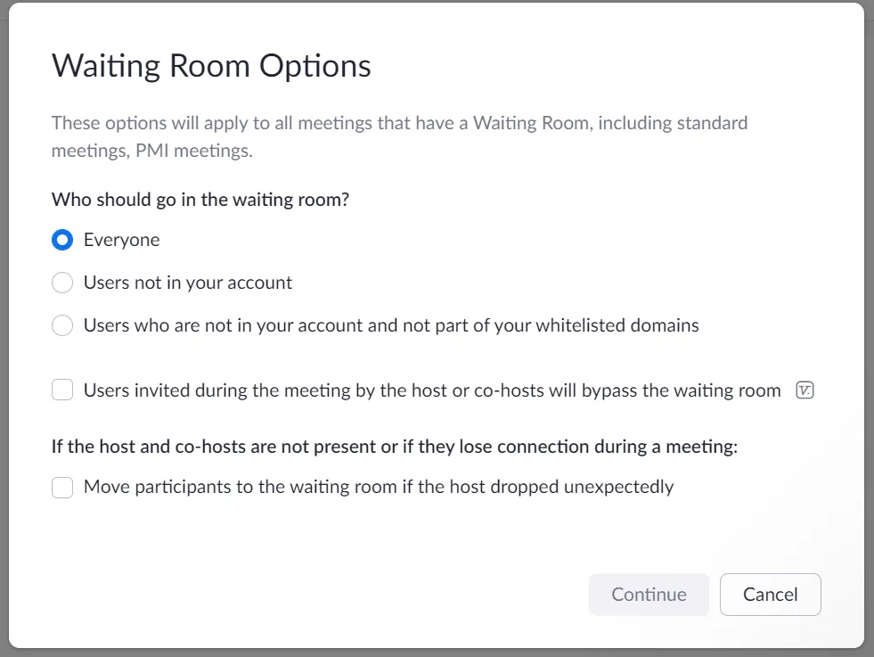 Method C (Not recommended): Place all participants in the Waiting Room first. Then give each participant the host’s permission to enter the meeting room. This method is useful when the host knows the participants in advance, but not suitable for online classes where the host (instructor) may not know all the students.