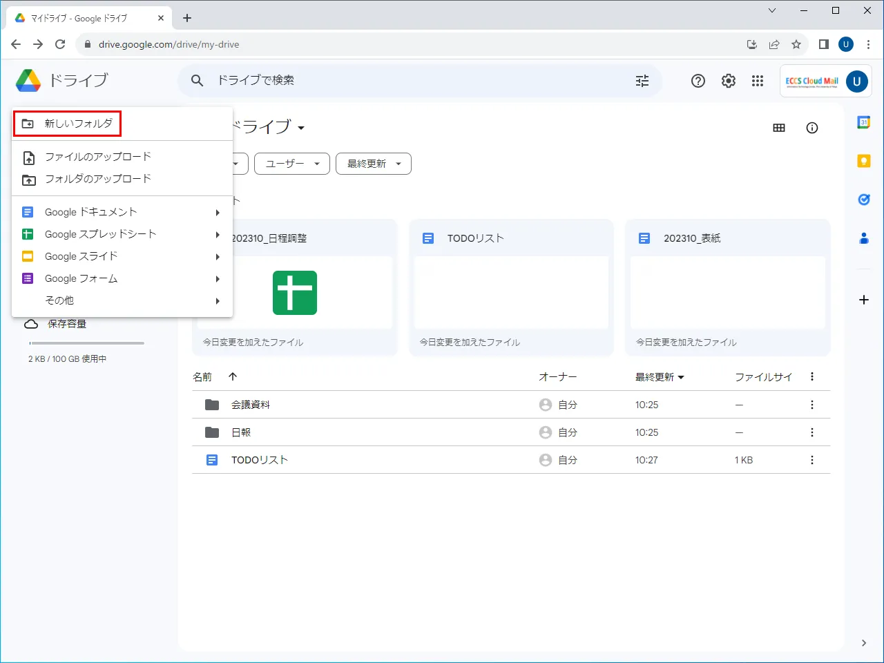以降の手順を行うには,あらかじめECCSクラウドメールにログインし,ブラウザ上でGoogleドライブを開いている必要があります.この作業が完了していない場合には,Googleドライブのページの「ブラウザ上でGoogleドライブを開く」を参照してください.