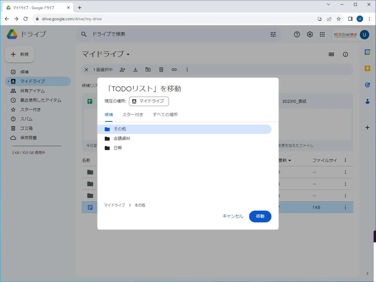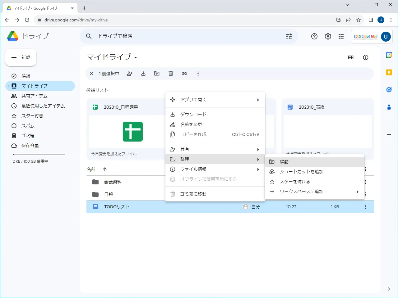 ここでは,ファイルが置かれているフォルダを変更することで,Googleドライブ上のファイルを移動させる方法を説明します.