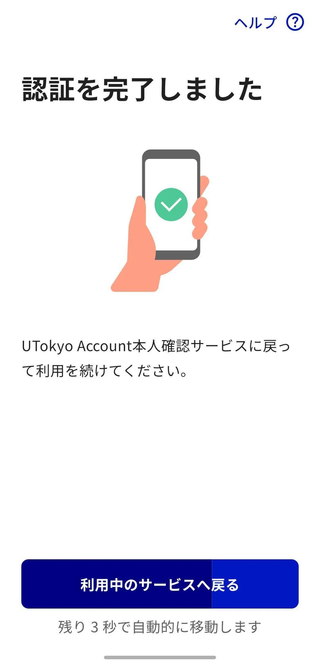 9. デジタル認証アプリの「利用中のサービスへ戻る」を押すか,画面遷移後10秒経過するのを待ってください.UTokyo Account本人確認サービスへ戻ります.