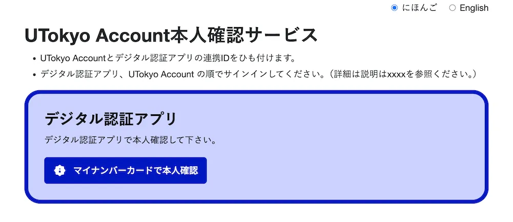 続いて,マイナンバーカードとデジタル認証アプリを用いた本人認証を行います.UTokyo Account本人確認サービスにスマートフォンのみで認証する場合と,PCとスマートフォンを併用して認証する場合で手順が少し異なります.なお,スマートフォンのみで行う方が簡便です.それぞれ対応する手順を参照し,作業を進めてください.