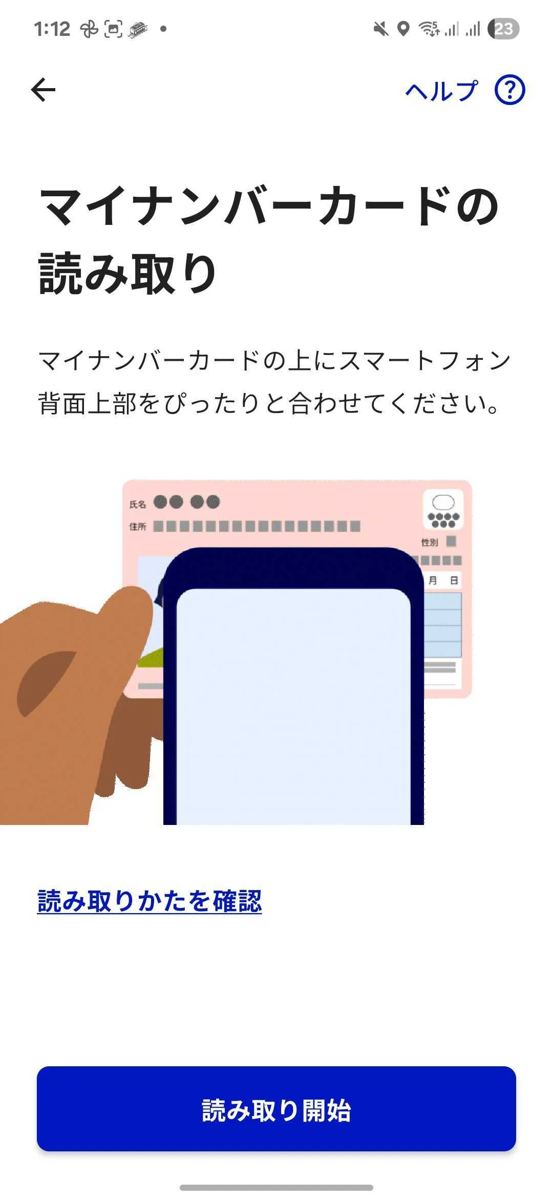 7. アプリの案内に従い,「読み取り開始」ボタンを押し,マイナンバーカードをスマートフォンで読み取ってください.