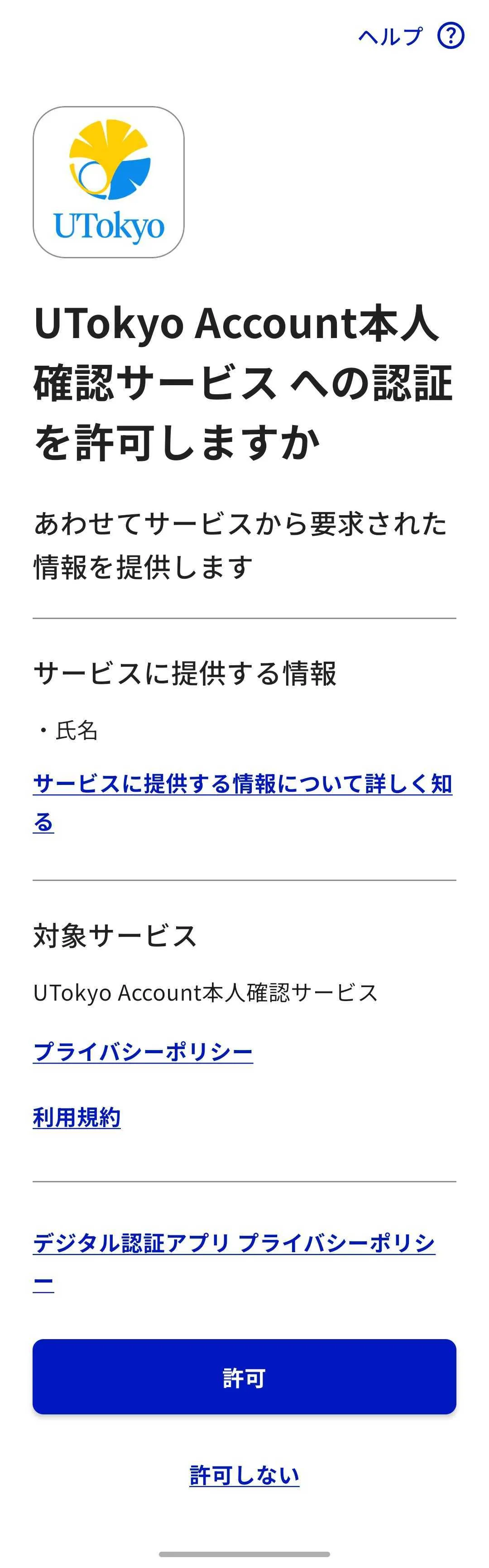 10. UTokyo Account本人確認サービスへの認証の許可を求める画面が表示されます.プライバシーポリシーや利用規約を確認の上,「許可」ボタンを押してください.