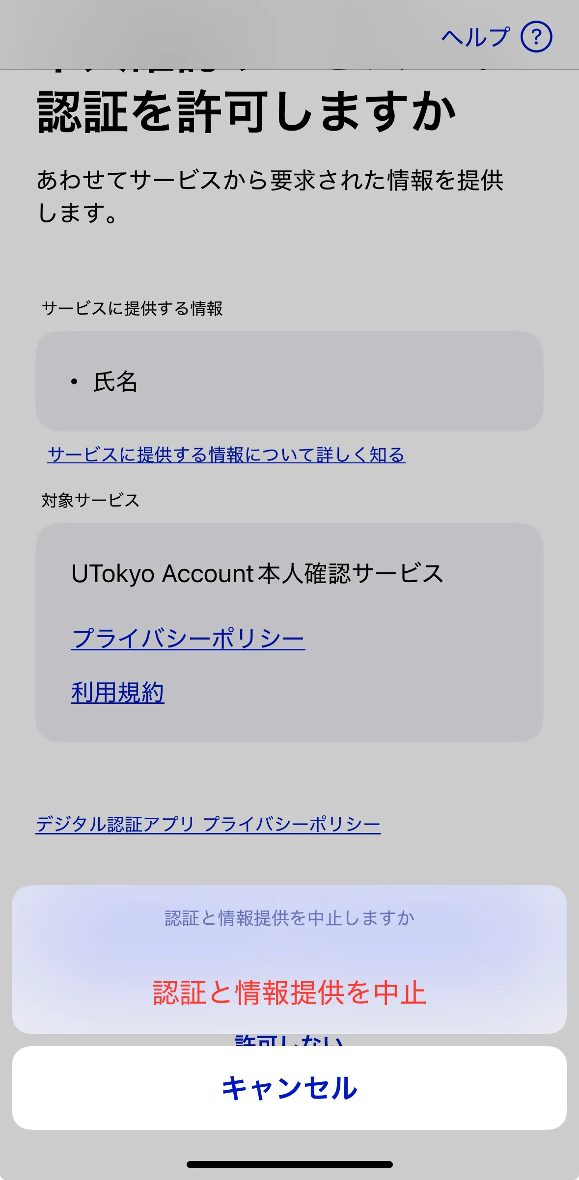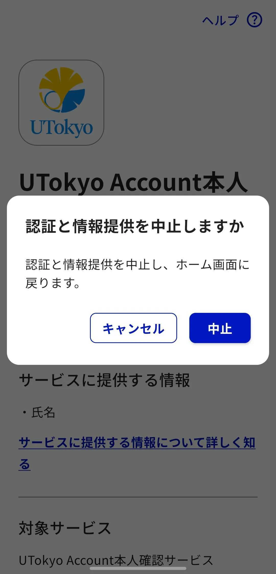 AndroidとiOSで少し形式が異なりますが「認証と情報提供を中止しますか」という選択ボタンが出現します.「中止」を選択した場合,UTokyo Account本人確認サービス側が対応していないためBad Requestと表示されるページに移動します.UTokyo Account本人確認サービスのページにアクセスし直し,手順2の最初からやり直してください.このポップアップのキャンセルを押した場合は元の画面に戻るので,続きの手順を進めてください.