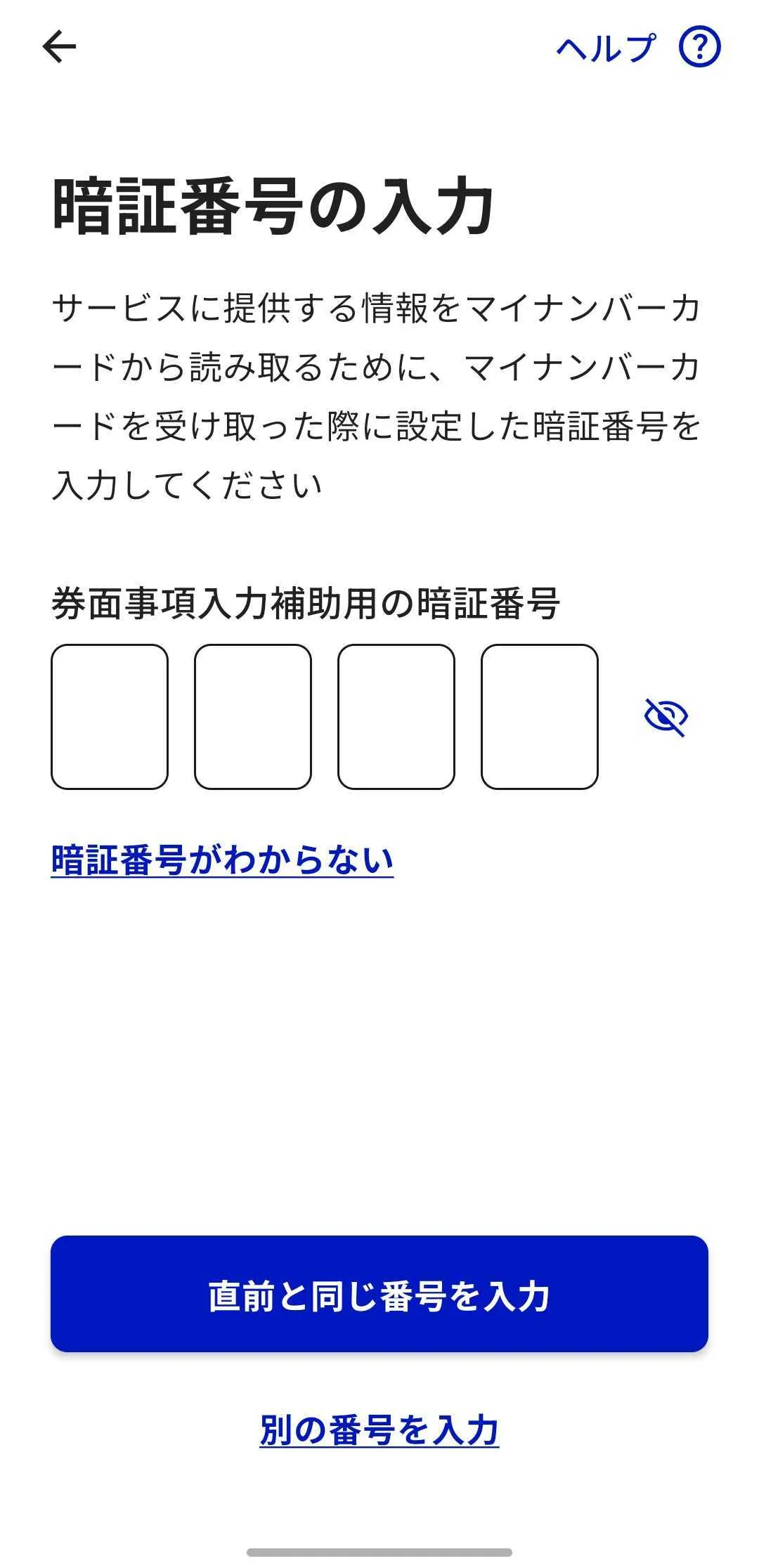 6. 券面事項入力補助用の暗証番号を入力してください.利用者証明用電子証明書の暗証番号と同じ物を使用している場合は「直前と同じ番号を入力」ボタンを押すことで省略できます.
