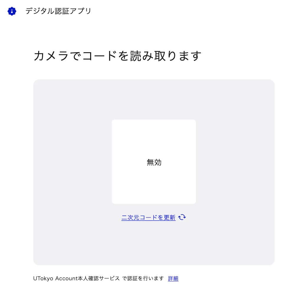 3. 画面上に表示された大きなQRコードを,手順1でセットアップを済ませたスマートフォンで読み込んでください.QRコードが無効になった場合は,下にでる「二次元コードを更新」を押してQRコードを更新してください.以降PCのページは閉じないでください