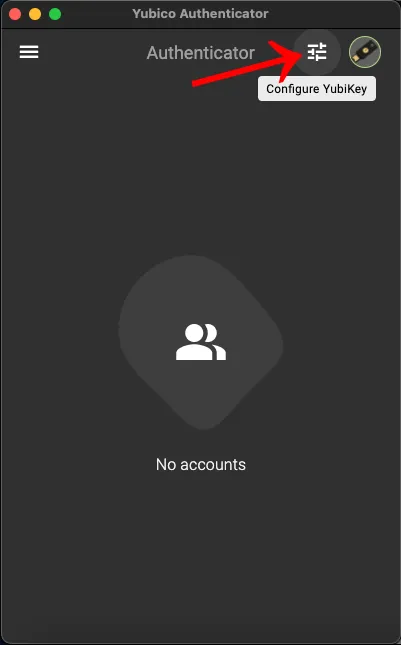 - Yubico Authenticatorアプリにアカウントを追加するため,画面右上の「Configure Yubikey」を押して,表示された画面で「Add account」を押してください.