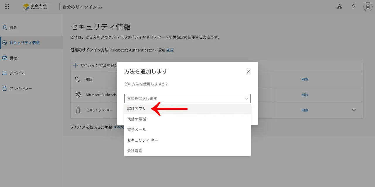 - 「認証アプリ」を選択し,「追加」を押してください.