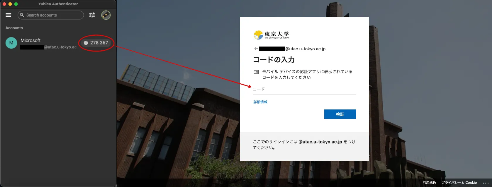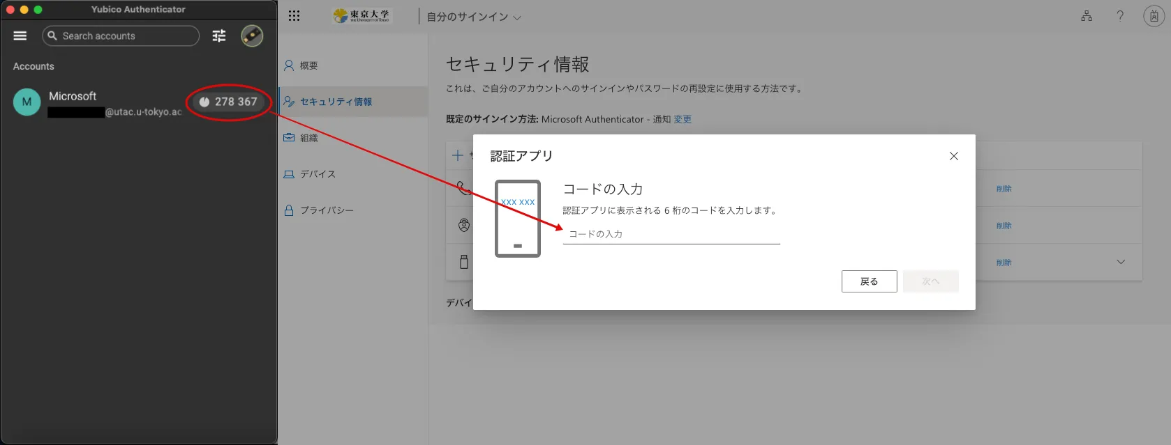 - 「コードの入力」という入力欄が表示されるので,YubiKeyを接続した状態でYubico Authenticatorアプリを開いて6桁の数字を確認し,それを入力欄に入力してください.