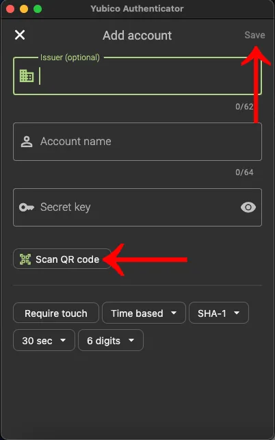 - 「Scan QR code」を押して,画面の指示に従ってQRコードを読み取り,「Save」を押してください.