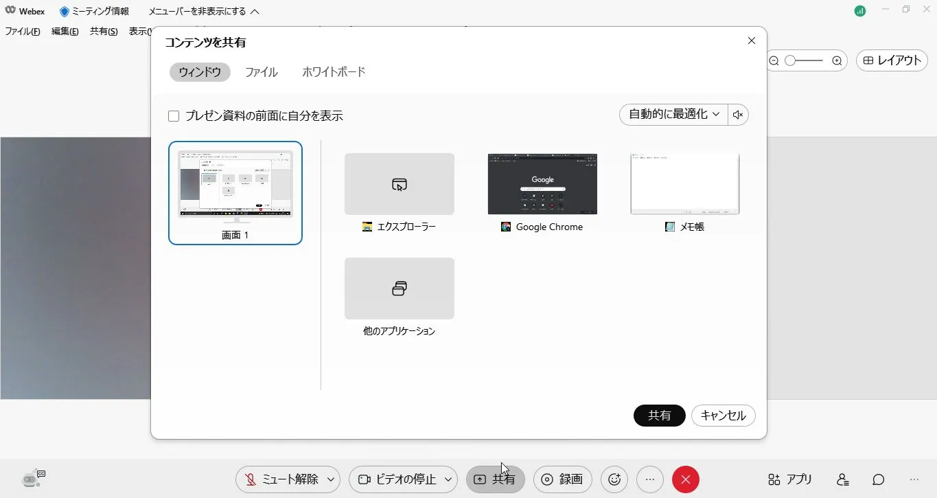 - 現在開いているウィンドウも選択肢に表示されます.ウィンドウ単位で画面共有することもできます.ウィンドウ以外の場所を見られたくない場合は,そのウィンドウを選択して画面共有することをおすすめします.