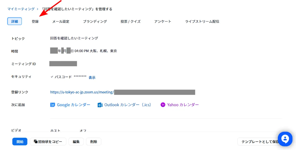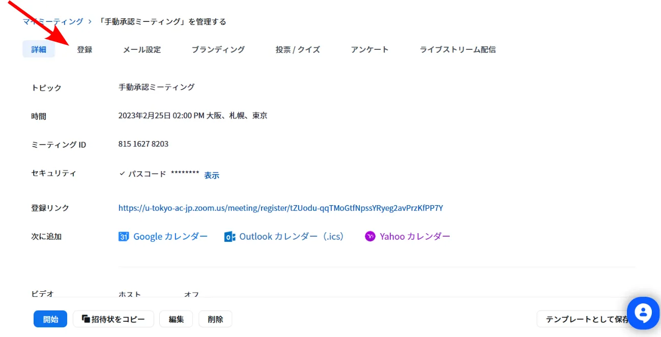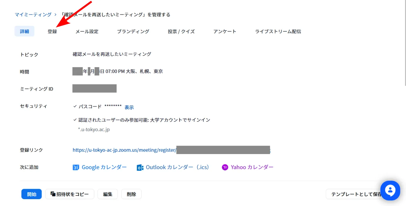 3. ミーティングの情報が表示されます.上の方に「登録」「メール設定」等のタブが並んでいます.「登録」タブを選択してください.