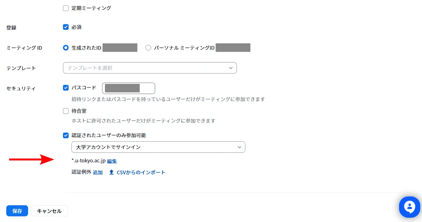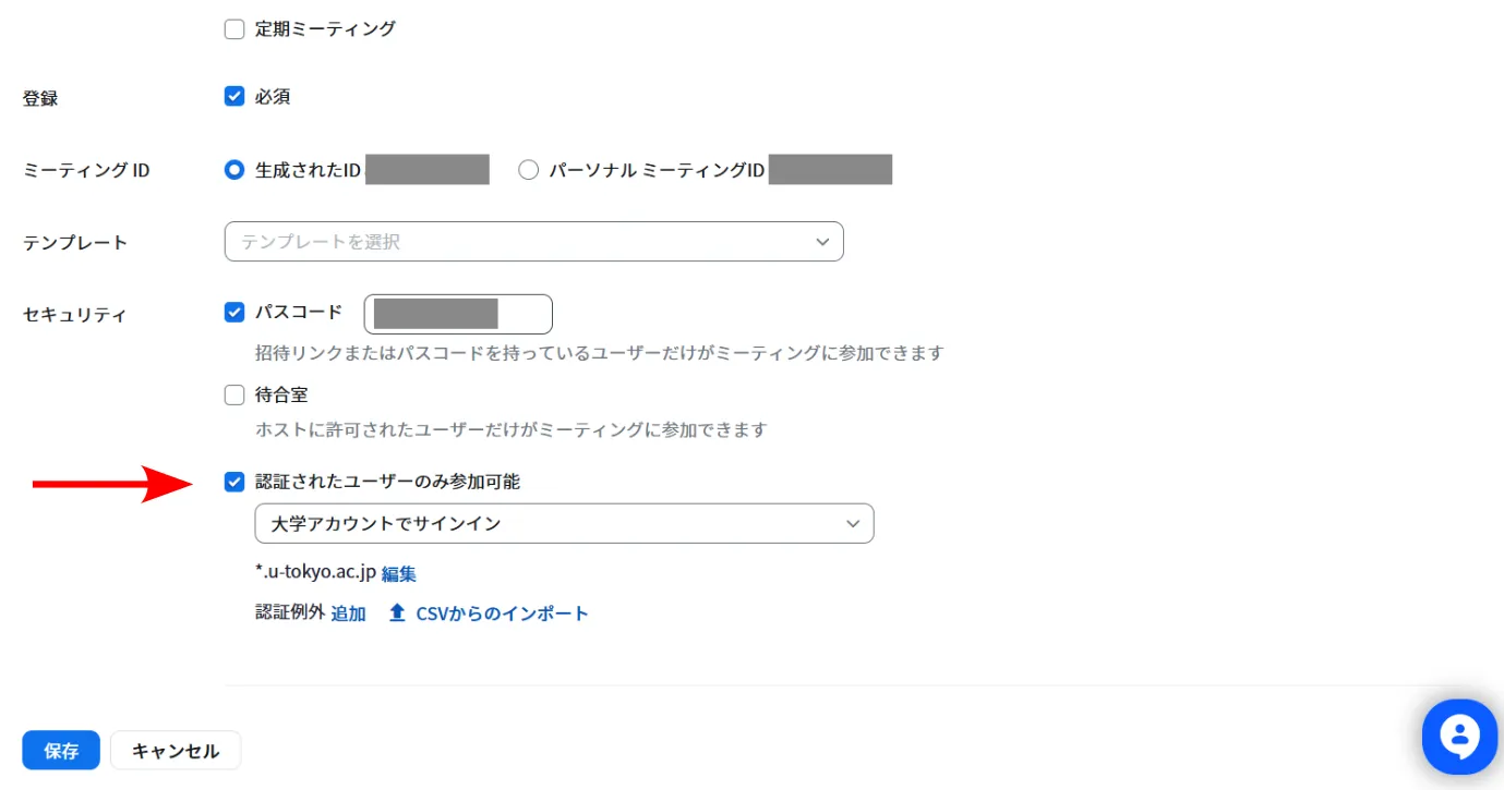 ここでは,事前登録を学内向けに制限できる「参加時に認証を求める」オプションについて説明します. これは,特定のメールアドレスを持つ参加希望者だけが事前の登録をできるようにするオプションです. 東京大学の構成員のみに割り当てられる,末尾がu-tokyo.ac.jpのメールアドレスを持つ参加希望者だけが登録できるようにすれば,「参加者の登録」を学内向けに制限できます.
