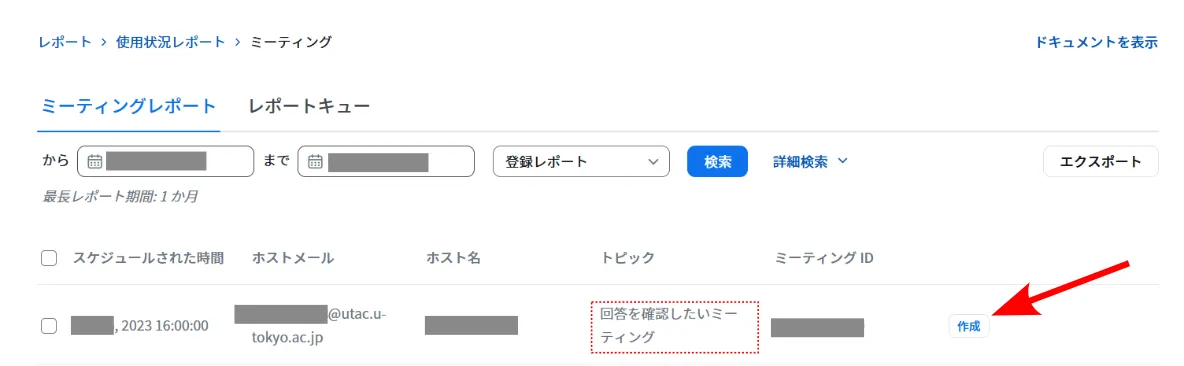 5. ミーティングの一覧が表示されます.集計結果を見たいミーティングを探し,右側にある「作成」ボタンを押してください.