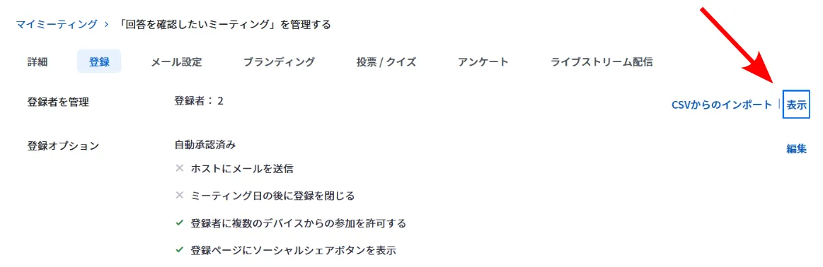 4. 「登録者を管理」欄の右側にある「表示」(手動承認を有効にしている場合は「編集」)ボタンを押してください.