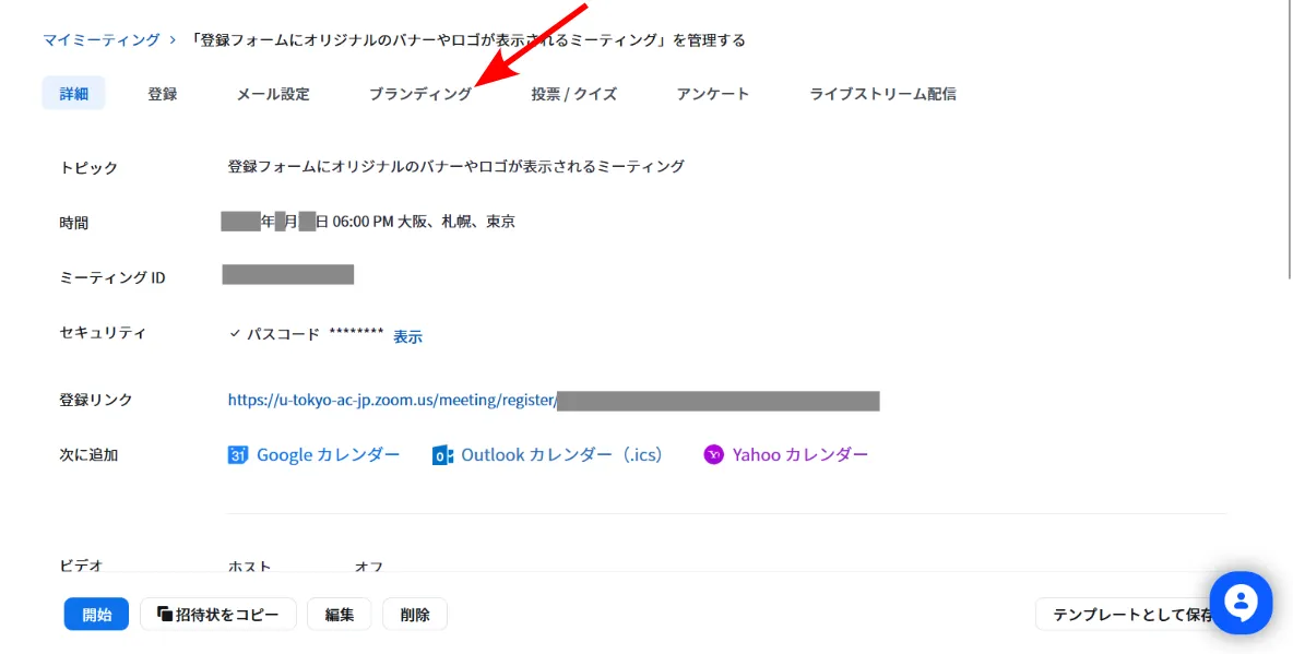 3. ミーティングの情報が表示されます.上の方に「登録」「メール設定」等のタブが並んでいます.「ブランディング」タブを選択してください.