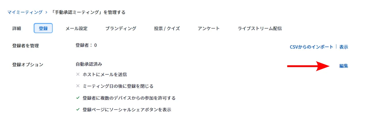 すでに作成されたミーティングで「参加者の登録」機能を有効にする場合(非推奨)