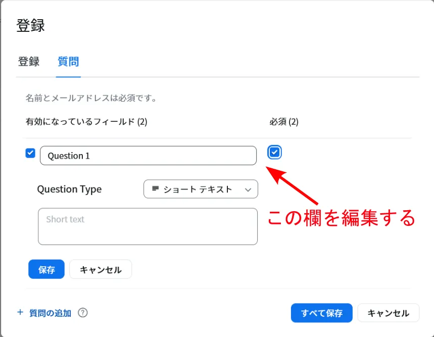 4. 質問への回答を必須とするためには,右側の「必須」列のチェックボックスをオンにしてください.